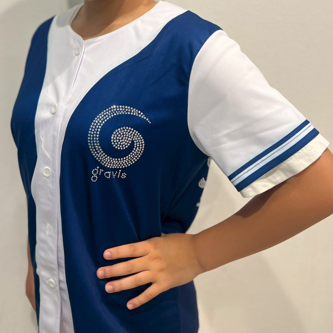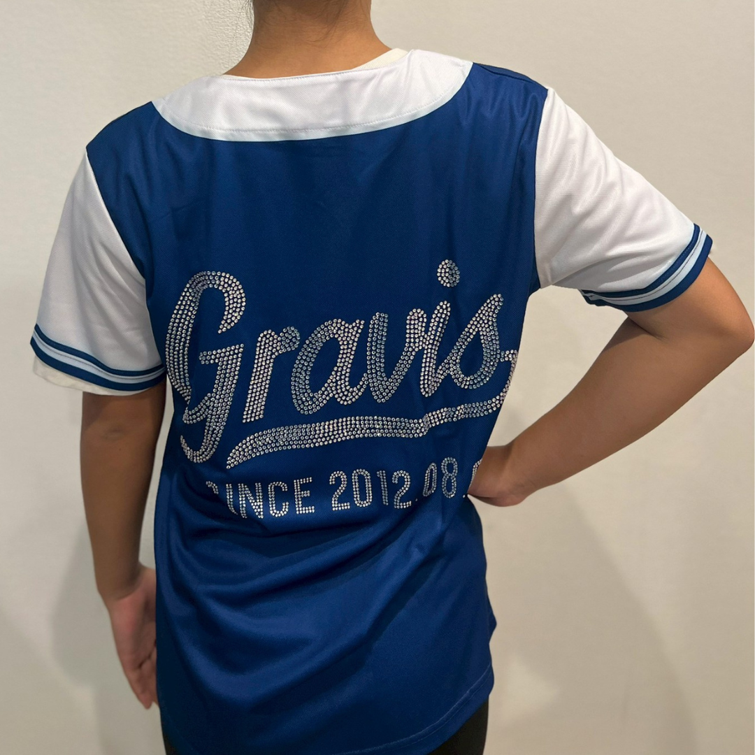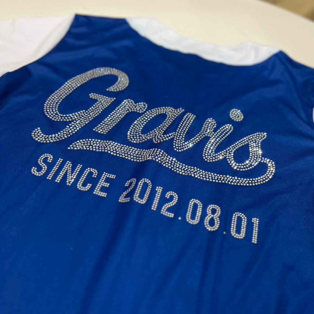 オリジナル・プレミアムユニフォームトップスGravis創立日「2012.08.01」から13周年を記念して登場した、特別仕様のユニフォームトップス。ネイビーにホワイトスリーブを合わせた爽やかなデザインに、ラインストーンで輝く「Gravis」ロゴと記念日を刻印しました。ライトに反射してきらめくストーンが、ステージでも日常でも存在感を放ちます。高品質素材を採用し、軽やかで動きやすい着心地を実現。日常の練習などにも取り入れられるプレミアムアイテムです。これであなたも「Team Gravis」!